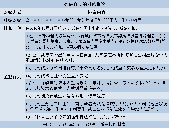 資料顯示,魏慶華曾與10位投資方(8個(gè)投資機(jī)構(gòu)、2名個(gè)人投資者)簽訂對(duì)賭協(xié)議,內(nèi)容涉及企業(yè)財(cái)務(wù)業(yè)績(jī)、掛牌時(shí)間,以及實(shí)際控制人的控制權(quán)、誠(chéng)信問(wèn)題等多方面。雙方并約定,一旦觸發(fā)對(duì)賭失敗的條款,投資人有權(quán)要求魏慶華按約定的價(jià)格回購(gòu)部分或全部股份。