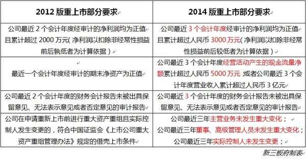 實際上,2012年和2014年兩個版本的上市規(guī)則大不相同,后者對申請重上市公司的申請標準大大提高。