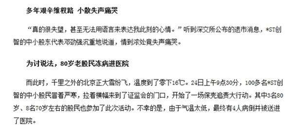 回顧2012年12月24日,在暫停上市6年后,ST創(chuàng)智被強制退市,彼時媒體報道下的創(chuàng)智股民,多是失望憤怒的,比如“多年艱辛維權(quán)路,小散失聲痛哭”、“為討說法,80歲老股民凍病進醫(yī)院”。