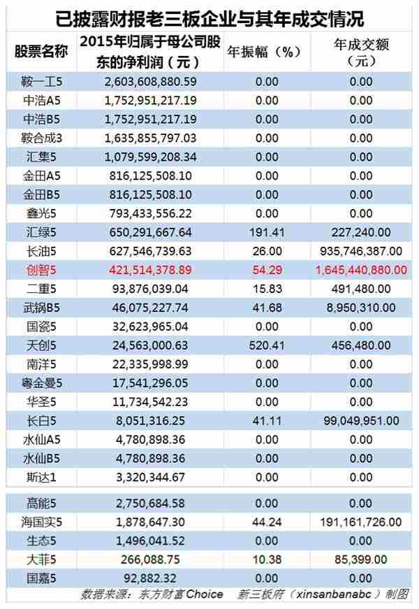 新三板府統(tǒng)計了2015年盈利的27家“老三板”企業(yè)的凈利潤、股價振幅以及成交額情況,如下表: