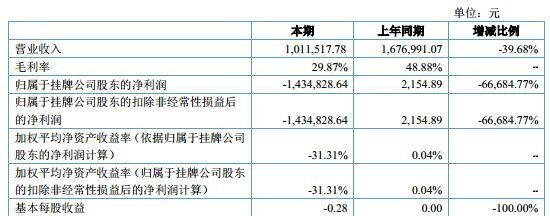 8月2日晚間,欣易晨發(fā)布2016年半年度報(bào)告。報(bào)告期內(nèi),欣易晨完成營(yíng)收101.15萬元,相較上年同期的167.70萬元下降了39.68%;歸屬于掛牌公司股東的凈利潤(rùn)為-143.48萬元,上年同期為2154.89元,同比暴跌66684.77%;基本每股收益為-0.28元,同比下降100%。