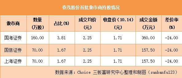 富姐查看了春茂股份做市首日介入并至今仍持有的券商持倉情況,發(fā)現(xiàn)國海證券、國信證券、上海證券皆以2.25元/股的價格介入春茂股份,合計持股300萬股,至今已賬面浮虧超過20%,有止跌拋盤的風險。