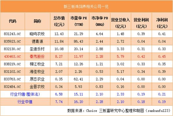 富姐統(tǒng)計了新三板雞飼養(yǎng)相關(guān)公司的情況,市盈率11.97倍的春茂股份,低于行業(yè)平均市盈率的15倍,在8家同行公司中排行倒數(shù)第三。
