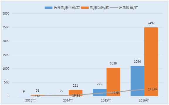 相關(guān)數(shù)據(jù)顯示,截至11月4日,新三板股權(quán)質(zhì)押融資公告2497起,共出質(zhì)243.84億股,涉及公司約1094家;而去年共有275家掛牌企業(yè)出質(zhì)1038次,共質(zhì)押112.63億股;今年質(zhì)押股數(shù)已經(jīng)是去年兩倍,而參與質(zhì)押的掛牌公司接近去年4倍。