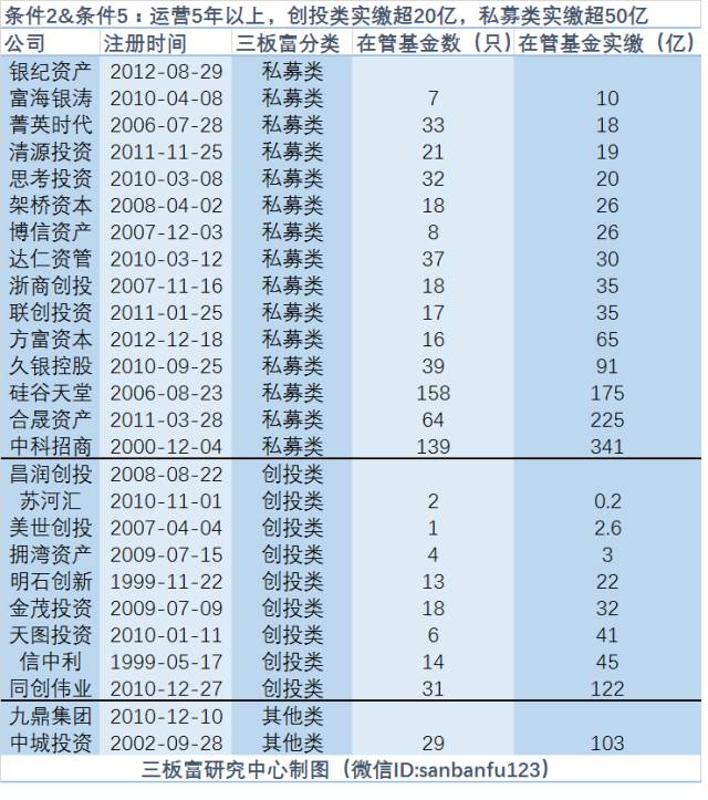 私募股權(quán)投資類(lèi),方富資本、久銀控股、硅谷天堂、合晟資產(chǎn)、中科招商都已超過(guò)50億規(guī)模,另有菁英時(shí)代、清源投資、思考投資、架橋資本、博信資產(chǎn)、達(dá)仁資管、浙商創(chuàng)投、聯(lián)創(chuàng)投資這8家規(guī)模處于20~50億之間,規(guī)模如能進(jìn)一步增長(zhǎng),或爭(zhēng)取列為創(chuàng)投類(lèi),也有望達(dá)標(biāo)。唯獨(dú)富海銀濤規(guī)模只有10億,不上不下,達(dá)標(biāo)難度很大;但若因此被摘牌,又顯得可惜。