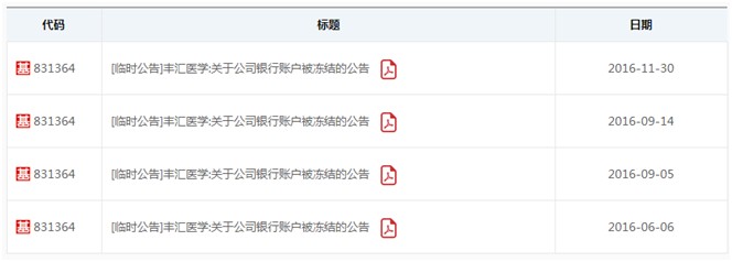 此次豐匯醫(yī)學(xué)上海銀行盧灣支行賬戶被凍結(jié),金額為130萬元,但由于賬戶余額不足,目前被凍結(jié)了 14.7萬元。然而,這并不是公司第一次銀行賬戶被凍結(jié),府爺查閱公告,公司自今年6月以來共計(jì)包括基本戶在內(nèi)的5家銀行賬戶被凍,合計(jì)金額約987萬元。