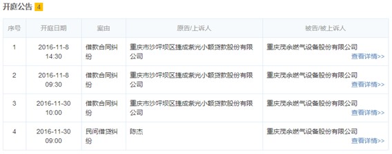 值得一提的是,茂余集團(tuán)最近經(jīng)濟(jì)問題貌似比較令人憂心。啟信寶顯示,茂余集團(tuán)自今年10月份以來,共有5份開庭記錄,其中3起是民間借貸糾紛,原告分別是自然人陳杰及周文勝,另外3次則是與捷成紫光小貸公司之間發(fā)生借款合同糾紛,而與周文勝的官司直接導(dǎo)致了茂余燃?xì)獾墓煞荼粌鼋Y(jié)。
