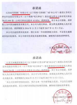 11月4日,明天種業(yè)曾發(fā)布兩條公告,內(nèi)容是關(guān)于天坤集團(tuán)及丹陽(yáng)酒廠接受明天種業(yè)擔(dān)保的承諾函。實(shí)際控制人胡玉萍質(zhì)押7862.24萬股,占公司總股本63.92%,用于丹陽(yáng)酒廠向中國(guó)金融租賃有限公司借款1.8億元提供質(zhì)押擔(dān)保;股東陳鎖連質(zhì)押2843.97萬股,占公司總股本23.12%,用于天坤集團(tuán)向萬新光學(xué)集團(tuán)有限公司2.25億元借款提供質(zhì)押擔(dān)保。