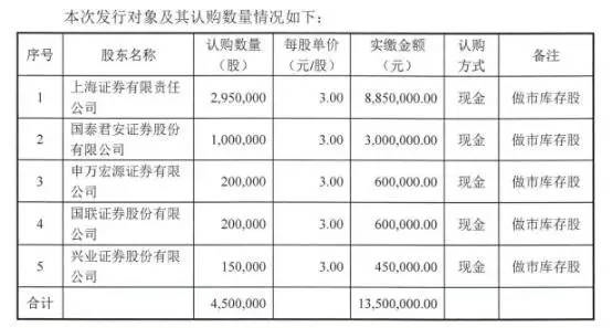 發(fā)行對(duì)象為5家證券公司,包括上海證券、國泰君安、申萬宏源、國聯(lián)證券、興業(yè)證券。其中,國泰君安為上海證券控股股東,二者合計(jì)認(rèn)購395萬股,占此次發(fā)行450萬股股份的87%。