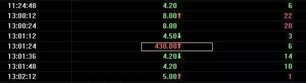 午盤開盤,就在一大波以4.20元、4.50元成交的榜單上,驚現(xiàn)了以430元/股成交6手的大烏龍,在k線圖上留下一根長長的上引線。