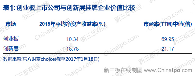 新三板在線據(jù)Choice統(tǒng)計(jì)顯示,創(chuàng)新層2015年平均凈資產(chǎn)收益率18.78%,遠(yuǎn)高于創(chuàng)業(yè)板的10.34%,然而市盈率只有21.17倍,遠(yuǎn)低于創(chuàng)業(yè)板的69.95倍。這表明新三板創(chuàng)新層企業(yè)的盈利能力遠(yuǎn)高于創(chuàng)業(yè)板,同時(shí)也意味著創(chuàng)新層能給投資者帶來更高的收益。