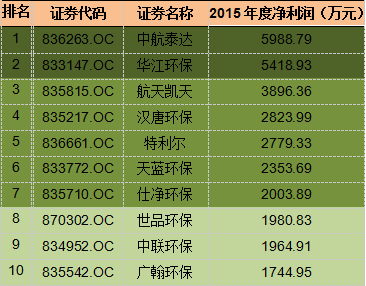 新三板大氣污染治理企業(yè)2015年度凈利潤TOP10