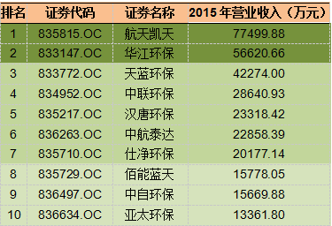 新三板大氣污染治理企業(yè)2015年度營業(yè)收入TOP10