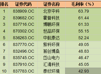 新三板大氣污染治理企業(yè)最新銷售毛利率TOP10