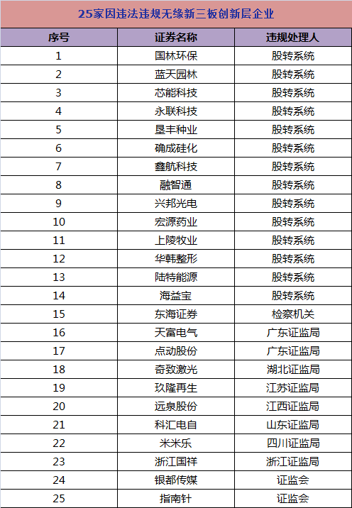 在新三板企業(yè)為留在或進入創(chuàng)新層各顯神通的同時,今年已有25家企業(yè)注定無緣創(chuàng)新層。畢竟各項財務數(shù)據(jù)可以“修改”,但板上釘釘?shù)倪`法違規(guī)事實已然涂抹不去。
