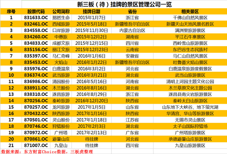 其實(shí),在今年1月出現(xiàn)的景區(qū)企業(yè)扎堆掛牌的現(xiàn)象純屬偶然,目前新三板(待)掛牌的景區(qū)公司共計(jì)21家,而A股總共加起來也只有17家而已。