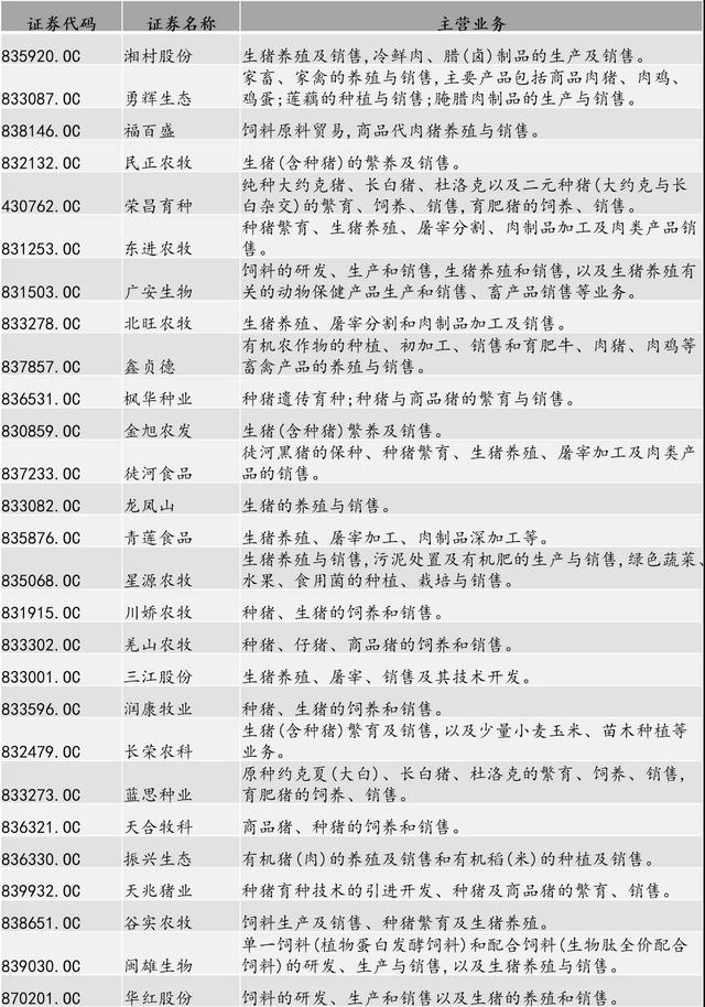 數(shù)據(jù)顯示,截至目前共有27家掛牌企業(yè)的主營(yíng)業(yè)務(wù)中包含養(yǎng)豬業(yè)務(wù)。具體包括湘村股份(835920)、羌山農(nóng)牧(833302)、民正農(nóng)牧(832132)、榮昌育種(430762)、楓華種業(yè)(836531)、龍鳳山(833082)等掛牌企業(yè)。