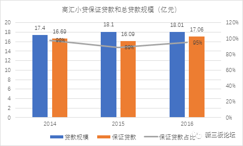 這一特點在商匯小貸這里表現(xiàn)得更明顯。公司近三年財務(wù)資料顯示,2014年至2016年,商匯小貸保證貸款占比分別為98%、89%、95%: