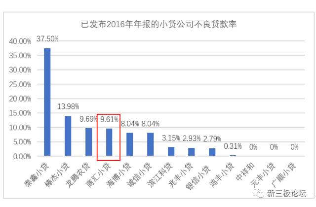 而從新三板小貸公司整體來看,在目前已經(jīng)發(fā)布2016年年報,并明確給出不良貸款率的13家小貸公司里,商匯小貸的不良貸款率排名第四,也居于比較高的水平: