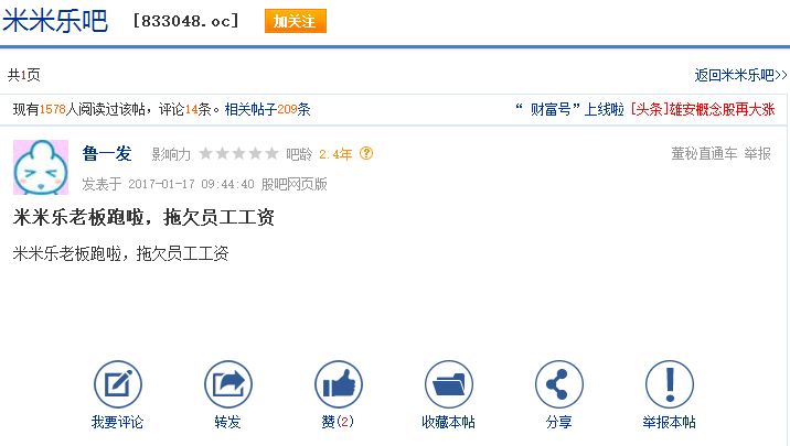 除此之外,截至3月8日,米米樂欠黃杰、池濟(jì)琴等31名員工工資經(jīng)濟(jì)補(bǔ)償金等共計169萬元。如今工資尚未支付完,劉文太就辭職了,這也引來被拖欠工資的員工的不滿,在一個名為“米米樂吧”的論壇上,網(wǎng)友們對劉文太可謂罵聲一片。