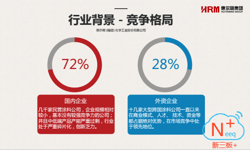 惠爾明成立于2001年,是一家專注于工業(yè)涂料的研發(fā)設(shè)計、生產(chǎn)銷售和工程服務(wù)的高新技術(shù)企業(yè)。產(chǎn)品廣泛應(yīng)用于輕工產(chǎn)品、工業(yè)防護(hù)、新型建材等領(lǐng)域,業(yè)務(wù)范圍涵蓋工業(yè)涂料、涂裝全產(chǎn)業(yè)鏈及相關(guān)的貿(mào)易金融。2015年3月,公司正式登錄新三板資本市場,是新三板上第一家涂料掛牌公司。