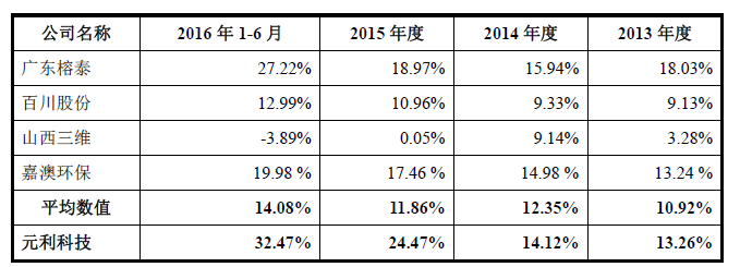 除了業(yè)績,元利科技毛利率的變化也十分驚人。2014年至2016年上半年,元利科技主營業(yè)務(wù)毛利率分別為14.23%、24.47%、32.61%。不僅增幅明顯,而且近兩年明顯優(yōu)于可比上市公司。