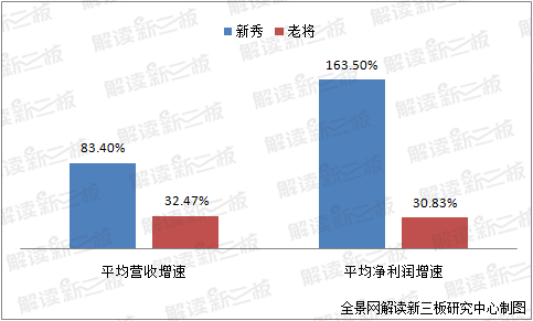 但在2016年業(yè)績(jī)?cè)鏊偕?,新晉企業(yè)2016年平均營(yíng)收增速為83.4%,歸母凈利潤(rùn)增速為163.5%;同期老成員平均營(yíng)收增速是32.47%,歸母凈利潤(rùn)增速為30.83%??磥?lái)大部分企業(yè)都要么是憑借強(qiáng)盈利能力滿(mǎn)足標(biāo)準(zhǔn)一入圍,要么是憑借高成長(zhǎng)性滿(mǎn)足標(biāo)準(zhǔn)二入圍,這個(gè)推論亦跟解讀新三板獨(dú)家統(tǒng)計(jì)的數(shù)據(jù)相符合。