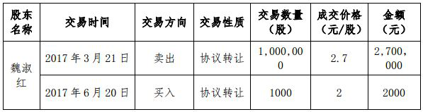 公告中通報(bào)了魏淑紅于2017年3月21日以協(xié)議轉(zhuǎn)讓的方式,以2.7元/股的價(jià)格賣出100萬股,合計(jì)交易金額270萬元;6月20日,魏淑紅又協(xié)議轉(zhuǎn)讓,以2元/股的價(jià)格買入1000股,交易金額2000元。上述交易完成后,魏淑紅持有199萬股,占公司總股本6.44%。