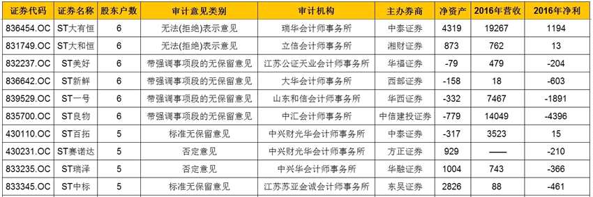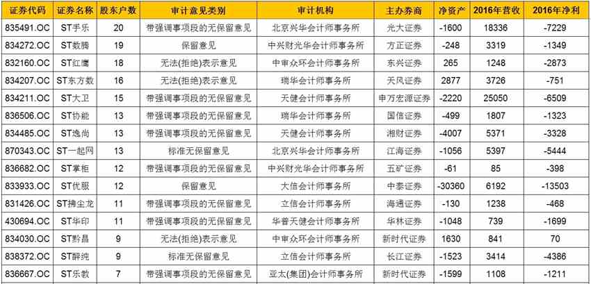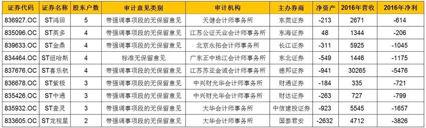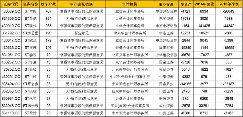 此外,僅上述29家被ST掛牌企業(yè),就合計擁有3291戶股東。其中,ST行悅(430357.OC 做市轉讓 17家做市商)2016年年報顯示,其擁有765戶股東,主營酒店高端專業(yè)智能硬件設備,及網(wǎng)絡和服務解決方案,2016年營收和凈利潤分別為9938萬元和-979萬元。