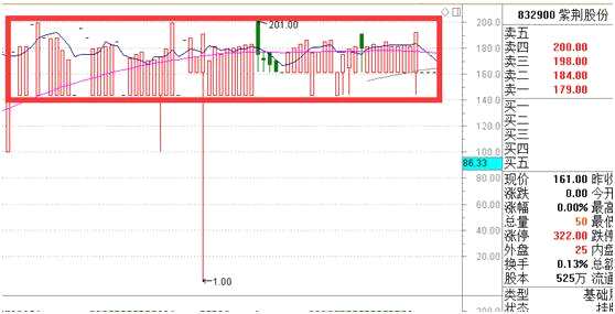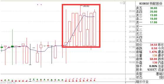 這種情況體現(xiàn)在走勢圖上就是重復(fù)出現(xiàn)相同或相似的日K線實體,這其中,以采取協(xié)議轉(zhuǎn)讓的公司更為突出。如新三板中目前股價較高的紫荊股份、網(wǎng)庫股份、特耐股份等交投都存在此類情況。盡管這些公司的業(yè)績并非一成不變,但公司股價卻幾乎常年雷打不動。