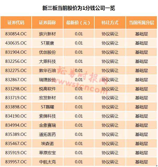 據(jù)記者統(tǒng)計,當(dāng)前新三板股價僅1分錢的公司已達(dá)16家,這些公司全部為股轉(zhuǎn)系統(tǒng)基礎(chǔ)層掛牌公司,且都采用協(xié)議轉(zhuǎn)讓方式。值得注意的是,上述公司中不少面臨終止掛牌風(fēng)險,如ST磊曜近日就一度因無法按時披露2016年報,被主辦券商提示存在終止掛牌風(fēng)險。族興新材則于7月17日向股轉(zhuǎn)系統(tǒng)提交終止掛牌申請,并已獲得受理。
