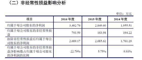 招股說明書披露,泰達新材2016年營業(yè)收入17,534.90萬元, 2015年營業(yè)收入20,644.40萬元,2016年較2015年大幅下滑。另外,泰達新材2016年損益表中非經(jīng)常性損益高達793.59萬元(基本上是政府補助,如下圖),占歸屬于母公司股東的凈利潤的比例高達22.79%,扣除非經(jīng)常性損益后歸屬于母公司股東的凈利潤僅有2,689.17萬元,與2015年2,685.62萬元相比,基本持平。而2014年扣除非經(jīng)常性損益后歸屬于母公司股東的凈利潤為1,761.29萬元,2015年的增長率達到了52.48%,而2016年增長率僅為0.1%,說明泰達新材的成長性已經(jīng)基本消失。