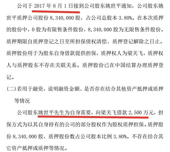 值得一提的是,據(jù)倍肯科技7月17日和7月27日公告披露內(nèi)容顯示,控股股東姚世平質(zhì)押834.00萬(wàn)股股份用于公司向自然人梁關(guān)飛的2500萬(wàn)元借款提供擔(dān)保。而在8月1日披露的股權(quán)質(zhì)押公告中又成了控股股東質(zhì)押834.00萬(wàn)股股份為自身向梁關(guān)飛借款2500萬(wàn)元做擔(dān)保。這2500萬(wàn)到底是公司還是控股股東姚世平個(gè)人所借,前后信披內(nèi)容存在出入。
