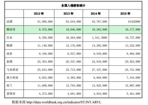 很多中國游客對(duì)摩洛哥頗為陌生,但世界范圍內(nèi),摩洛哥早已被視為著名旅游國家。據(jù)世界銀行數(shù)據(jù)顯示,直到2012年,摩洛哥全年入境游客人次還與日本、韓國相當(dāng),約為1000萬人次。但摩洛哥旅游業(yè)增長緩慢,到2015年仍停留在1000萬人次,而日本、韓國分別達(dá)到2000萬、1300萬。