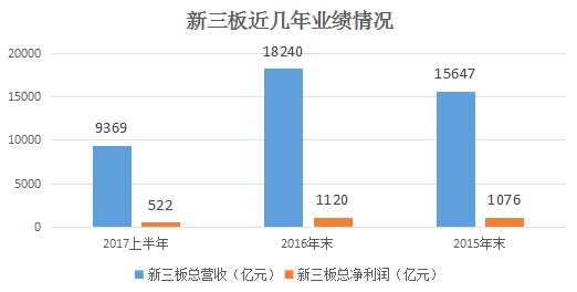 2017上半年,新三板全部公司整體營(yíng)業(yè)收入為9369億元,凈利潤(rùn)為522億元;而同期,茅臺(tái)實(shí)現(xiàn)營(yíng)業(yè)收入242億元,凈利潤(rùn)113億元。換句話說,新三板半年?duì)I收相當(dāng)于39個(gè)茅臺(tái),凈利潤(rùn)則相當(dāng)于5個(gè)茅臺(tái)。