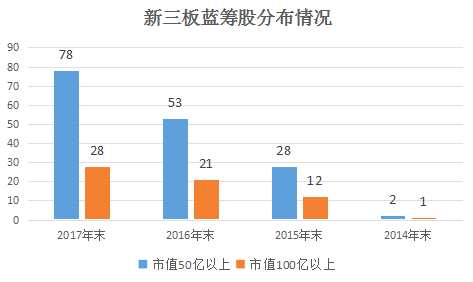 新三板總市值快速上升,除了受龐大的公司數(shù)目影響外,也得益于藍(lán)籌股的不斷脫穎而出。以市值做劃分,2014年,新三板總市值在50億以上的公司有2家,2015年-2017年則分別達(dá)到28家、53家和78家;2014年總市值超過100億的有1家,2015年-2017年則分別達(dá)到12家、21家和28家。