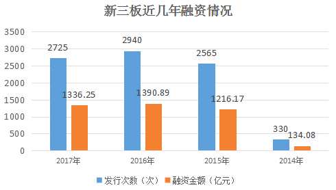 此外,融資能力不斷提升的新三板,也在中小微企業(yè)的發(fā)展過程中扮演了越來越重要的角色。2014年至2017年,新三板股票發(fā)行次數(shù)分別為330、2565、2940和2725,融資金額分別達(dá)到134.08億、1216.17億、1390.89億和1336.25億。