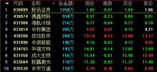 做市股成交額方面,創(chuàng)新層企業(yè)聯(lián)訊證券(830899)成交1250萬元居于做市成交額首位;基礎層方面,愛廸新能(831513)成交74.56萬元居首。