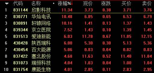 做市漲幅方面,基礎層企業(yè)欣影科技(831144)漲11.34%領漲做市股;創(chuàng)新層方面,中宇萬通(835539)漲5.68%居于創(chuàng)新居首位。