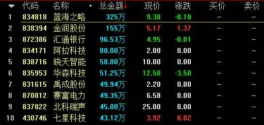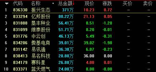 從成交額情況來看,創(chuàng)新層企業(yè)振興生態(tài)(836330)成交371萬元居首,基礎層企業(yè)藍海之略(834818)成交325萬元次之。
