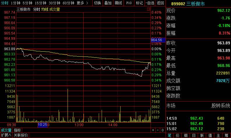 指數(shù)方面,三板做市(899002)今日以963.89點平開,指數(shù)開盤即持續(xù)下跌,午后指數(shù)跌幅擴大,盤中最低點跌至960.96點,創(chuàng)歷史新低,隨后指數(shù)開始小幅拉升,最終報收962.12點,跌幅為0.18%,成分股全天成交7028萬元。