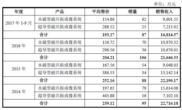 招股書披露,貝斯達(dá)的主導(dǎo)產(chǎn)品磁共振成像設(shè)備主要包括永磁型磁共振成像系統(tǒng)和超導(dǎo)型磁共振成像系統(tǒng),各報告期內(nèi)兩項產(chǎn)品占主營收入分別為79.01%、72.28%、61.79%、58.27%。其中,永磁型磁共振成像設(shè)備銷售單價從2014年的197.65萬元持續(xù)下降到2017年的154.86萬元,2015年的銷售單價就比2014年下降了30萬元,超導(dǎo)型磁共振成像設(shè)備也從2014年的443.88萬元下降至2017年的288.52萬元。