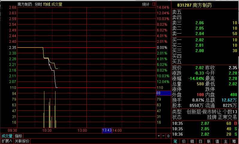 犀牛之星1月31日訊,早盤開盤后,創(chuàng)新層做市企業(yè)南方制藥(831207)大幅低開,隨后快速大幅下跌,截至10:40,跌至2.02元/股,跌幅達14.04%,成交12.62萬。