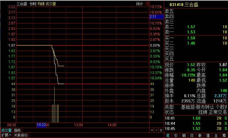 摘要: 犀牛之星1月31日訊,早盤開盤后,三合盛(831418)股價(jià)大幅下降,截至10:55,股價(jià)報(bào)1.52元/股,跌幅為18.72%。