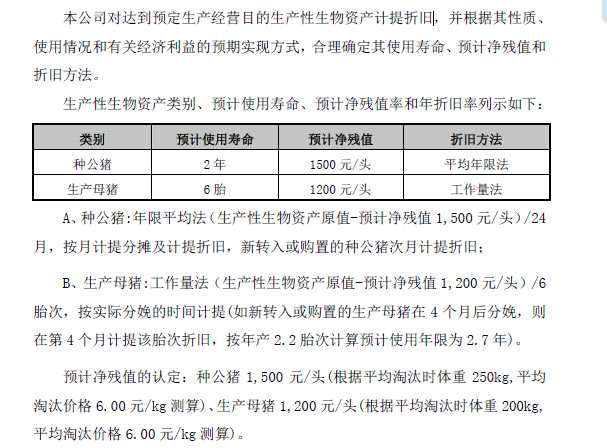 同行業(yè)的牧原股份(002714) 采取的是平均年限法計提折舊。安佑生物的方法有所不同,先將生產(chǎn)性生物資產(chǎn)分為公豬和母豬,其對公豬的折舊法與同行業(yè)其他公司一致。對于母豬,采用工作量法,預(yù)計工作量為6胎,每生一胎折舊一次。
