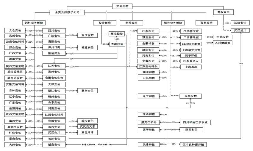 一系列的重組過后,安佑生物的股權(quán)架構(gòu)如圖所示。從持股情況來看,飼料業(yè)務(wù)板塊46家子公司大部分為直接持股100%,養(yǎng)殖板塊絕大部分為間接持股100%。