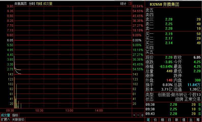 2月1日,創(chuàng)新層做市企業(yè)奔騰集團(tuán)(832650)復(fù)牌,公司股票以4.25元/股大幅低開(kāi),最低跌至2.20元/股,跌幅達(dá)63.64%。