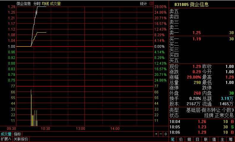 2月1日,早盤開盤后,微企信息(831805)大漲29%至1.29元/股。