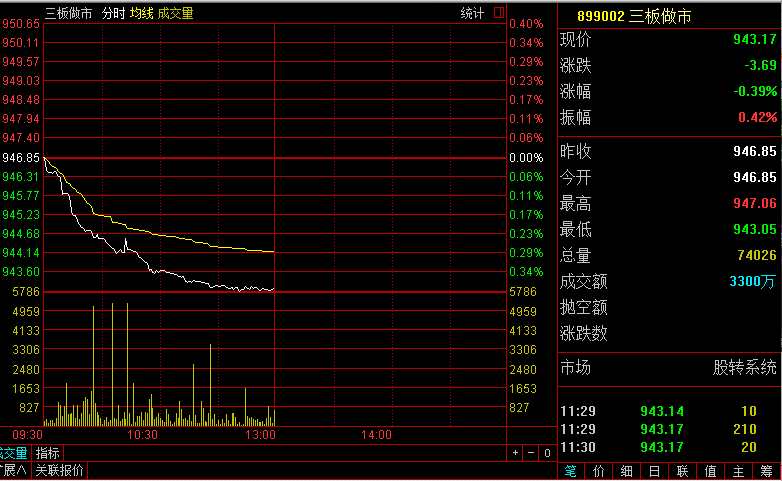 2月5日上午,創(chuàng)新層、基礎層分別成交3561.14萬、392.60萬,合計成交3953.74萬。指數(shù)方面,三板做市(899002)今日以946.85點平開,上午開盤后便一路快速震蕩下跌,最低報943.05點,再創(chuàng)新低。截止11:30,指數(shù)報收943.17點,跌幅為0.39%,成分股上午成交3300萬。