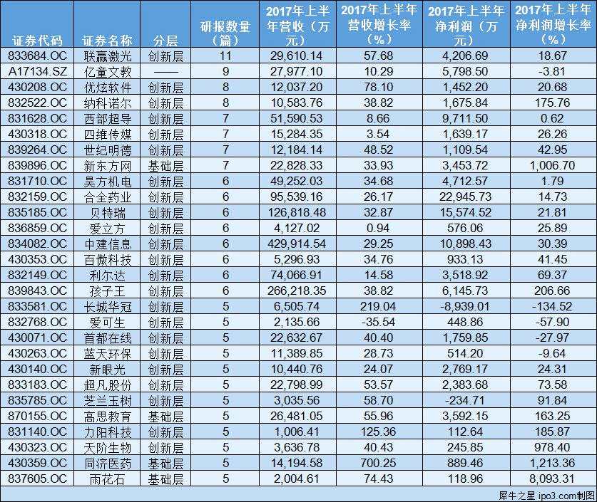 這當中,創(chuàng)新層聯(lián)贏激光(833684)研究報告數量最多,有6家券商及一家機構對其進行了研究,研究報告數量多達11篇;而研究報告數量達到5篇以上掛牌企業(yè)的共計28家,其中更有著23家創(chuàng)新層企業(yè)。